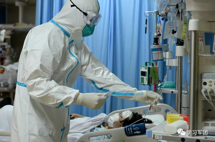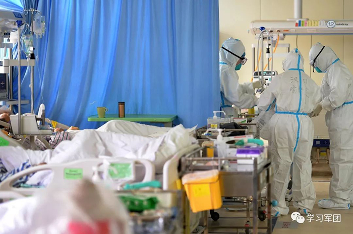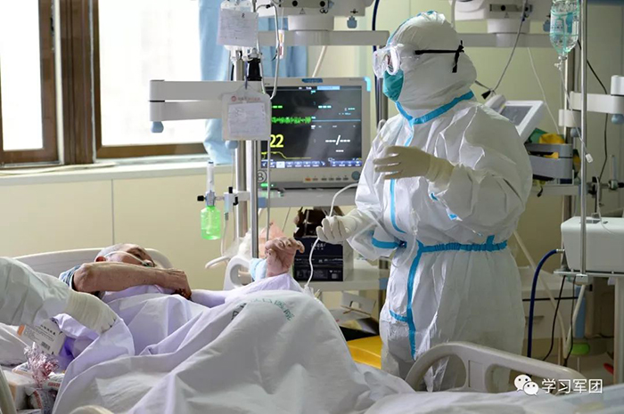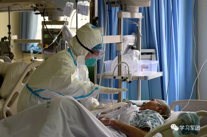 1月27日上午,海軍軍醫(yī)大學(xué)醫(yī)療隊醫(yī)護(hù)人員在漢口醫(yī)院重癥監(jiān)護(hù)室對新型冠狀病毒感染的肺炎患者進(jìn)行救治。醫(yī)護(hù)人員加強巡視,觀察輸液滴數(shù)。解放軍報記者范顯海攝
