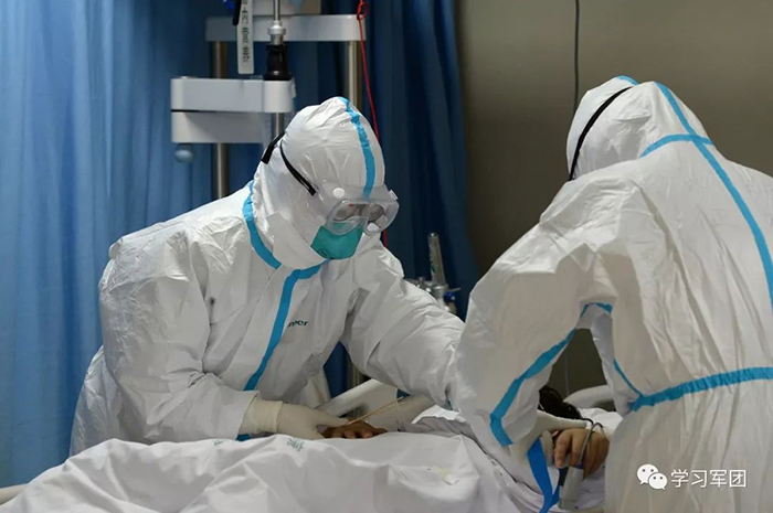 1月27日上午,海軍軍醫(yī)大學(xué)醫(yī)療隊醫(yī)護(hù)人員在漢口醫(yī)院重癥監(jiān)護(hù)室對新型冠狀病毒感染的肺炎患者進(jìn)行救治。醫(yī)護(hù)人員查看患者輸液導(dǎo)管是否通暢。解放軍報記者范顯海攝