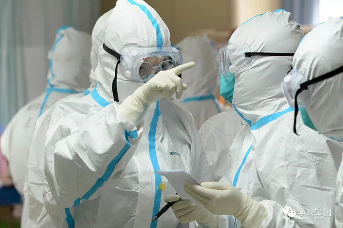 1月27日上午,海軍軍醫(yī)大學(xué)醫(yī)療隊醫(yī)護(hù)人員在漢口醫(yī)院重癥監(jiān)護(hù)室對新型冠狀病毒感染的肺炎患者進(jìn)行救治。醫(yī)護(hù)人員研究重癥患者治療方案。解放軍報記者范顯海攝