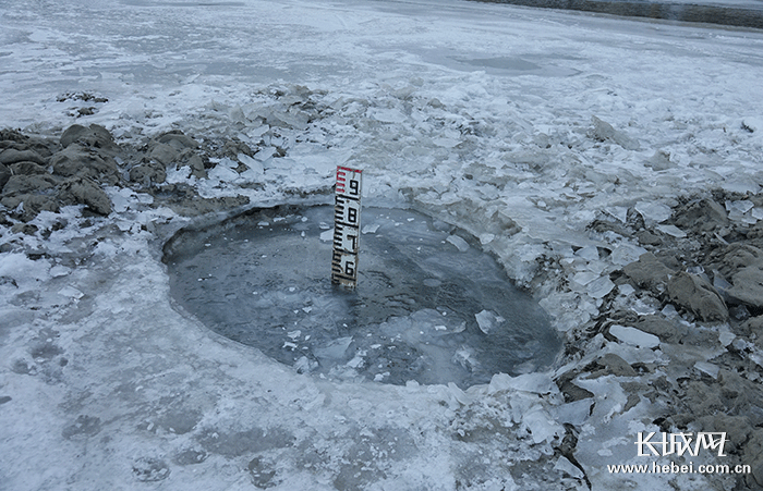 冬季的河水冰冷刺骨,賈海穿著救生衣和膠褲,戴上迷彩棉手套、火車(chē)頭帽子,拿著2米長(zhǎng)的探測(cè)桿邁入了冰冷的河水里進(jìn)行冰期測(cè)流,這一站就要半個(gè)小時(shí)。“夏季時(shí)可以用自動(dòng)化儀器鉛魚(yú)來(lái)施測(cè),冬季河面封凍結(jié)冰后儀器下不到水里,就只能人工施測(cè)?!辟Z海說(shuō)。
