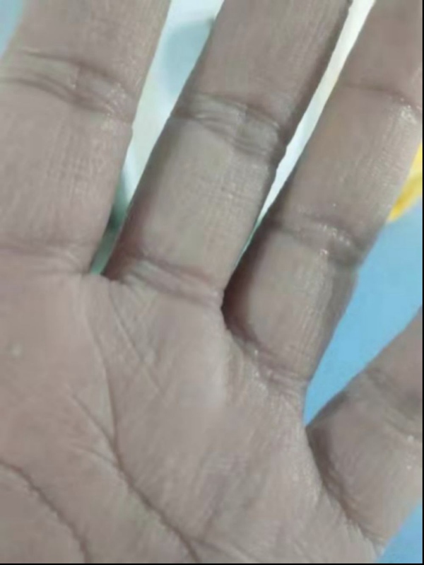 連續(xù)工作8小時(shí),中國科大附一院(安徽省立醫(yī)院)援鄂醫(yī)療隊(duì)隊(duì)員樊華手掌被汗水泡皺。