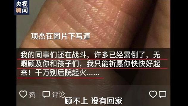 項杰在微信朋友圈寫道:“我的同事們還在戰(zhàn)斗,許多已經(jīng)累倒了,無暇顧及你和孩子們,我只能祈愿你快快好起來!千萬別后院起火。”