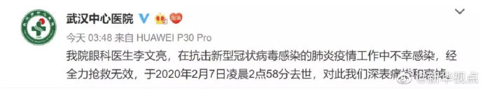 據(jù)@武漢中心醫(yī)院消息:武漢中心醫(yī)院眼科醫(yī)生李文亮,在抗擊新型冠狀病毒感染的肺炎疫情工作中不幸感染,經(jīng)全力搶救無(wú)效,于2020年2月7日凌晨2點(diǎn)58分去世,對(duì)此,醫(yī)院方面深表痛惜和哀悼。