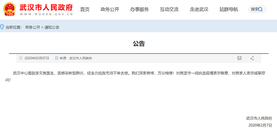 武漢市人民政府:李文亮醫(yī)生不幸去世 我們深表哀悼 萬分惋惜