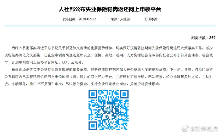 人社部公布失業(yè)保險穩(wěn)崗返還網上申領平臺-新華網