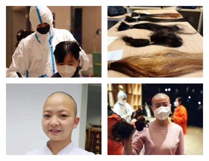 西安國際中心醫(yī)院醫(yī)療隊(duì)的女醫(yī)護(hù)正在剪發(fā)