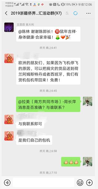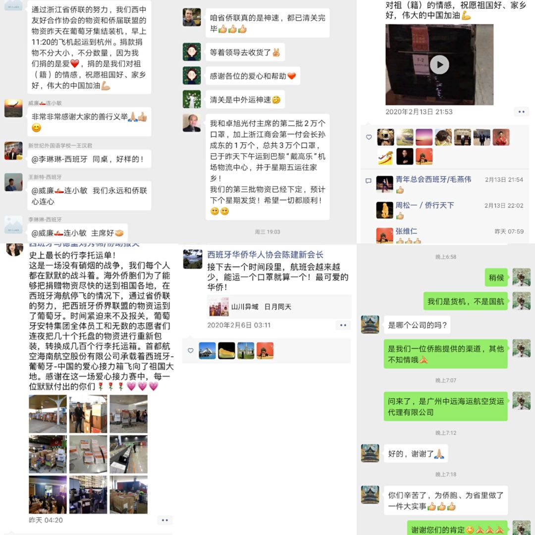 2月1日晚,浙江省僑界名媛匯微信群里的一則信息引起了大家的注意。“歐洲的朋友們,如果因為飛機停飛的原因,可以把捐災的貨品送到荷蘭阿姆斯特丹或者西班牙,我們有貨機包機帶回來!免費!”群里瞬間沸騰,求助信息紛至沓來。省僑聯(lián)黨組書記、主席連小敏捕捉到這一信息,隨即高度重視,求證確認后,第一時間研究討論,展開部署。