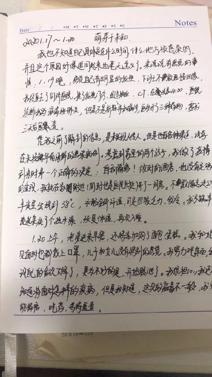 “1月20日—22日,第一次復查。食欲不振,發(fā)熱一陣一陣的,身體發(fā)虛,四肢無力,檢測結果為疑似病例,心中仍然忐忑,不知道自己的病情將走向何方。”