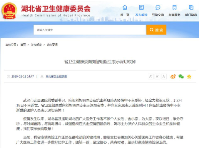 據(jù)湖北衛(wèi)健委網(wǎng)站消息,武漢市武昌醫(yī)院黨委副書(shū)記、院長(zhǎng)劉智明同志在抗擊新冠肺炎疫情中不幸感染,經(jīng)全力救治無(wú)效,于2月18日不幸殉職,終年51歲。