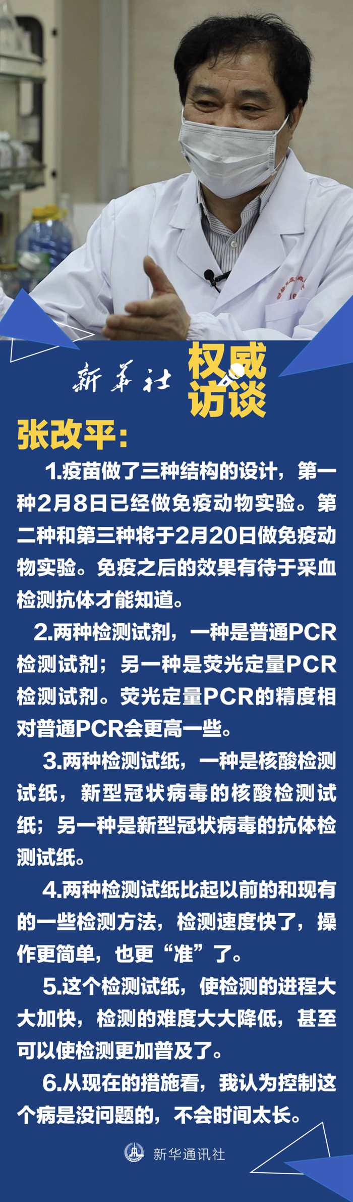 這些階段性研究成果是什么?三分鐘就可快速檢測新冠病毒的檢測試紙準(zhǔn)確率有多高?新冠病毒疫苗抗原的動物試驗效果如何?什么時間能夠推廣應(yīng)用?圍繞這些問題,新華社記者2月18日專訪了張改平院士。