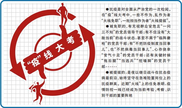 這次抗擊新冠肺炎疫情,是對(duì)全面從嚴(yán)治黨的一次檢閱,是領(lǐng)導(dǎo)干部政治素質(zhì)、宗旨意識(shí)、全局觀念、駕馭能力、擔(dān)當(dāng)精神的試金石、磨刀石?;鶎邮菆?zhí)政之基?!澳苷呱稀⒂拐呦?、劣者汰”,近期“火線”上的任免表明,疫情防控一線已經(jīng)成為當(dāng)前考驗(yàn)、考察、識(shí)別干部的重要陣地。(案例來源:新華社、中央紀(jì)委國家監(jiān)委網(wǎng)站、中國紀(jì)檢監(jiān)察報(bào)、湖北日?qǐng)?bào)等 記者黃海波、劉婧宇)