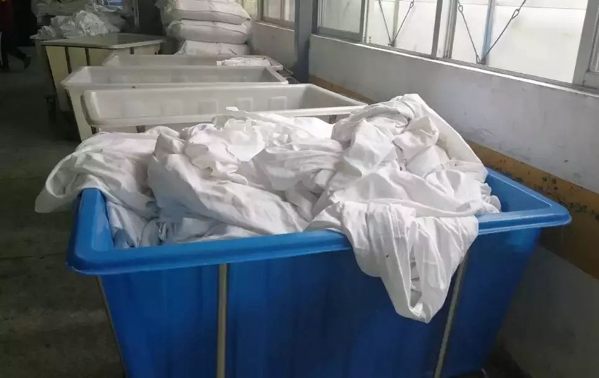 每趟列車到達(dá)終點(diǎn)站后,臥具都會(huì)重新更換,拆卸下的臥具由專人運(yùn)送至洗滌消毒中心。被套、枕套、床單等分別放在不同的待洗推車?yán)铮ぷ魅藛T會(huì)根據(jù)臥具的種類、污漬程度進(jìn)行分揀。