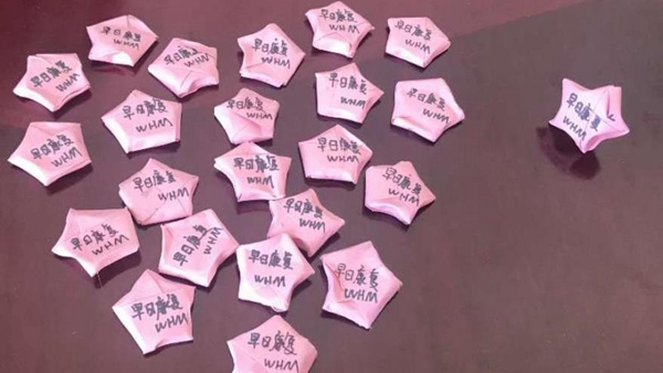 住進(jìn)武漢江夏區(qū)方艙醫(yī)院的輕癥患者不得不與家人隔離,不能出門活動(dòng),在初春的戶外仰望星空,暫時(shí)只能是一個(gè)愿望。2月20日的夜晚,夜班護(hù)士卻把“星星”帶進(jìn)了“方艙”!南京市中西醫(yī)結(jié)合醫(yī)院的護(hù)士王慧敏上班時(shí),向每一位患者贈(zèng)送了一個(gè)自己親手疊的許愿星,每一個(gè)“星星”都寫上了祝福的話語(yǔ):“叔叔阿姨晚上好,這是我自己做的許愿星,祝愿你們?cè)缛湛祻?fù)!”
