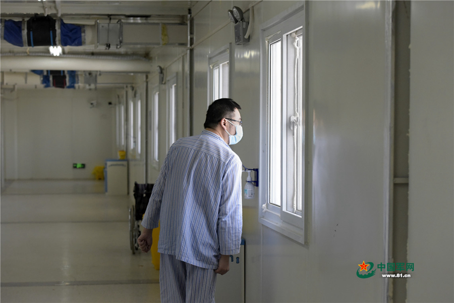 萬(wàn)先生從窗口望向窗外,在病房,他期待自己早日康復(fù)出院。中國(guó)軍網(wǎng)記者范顯海 攝