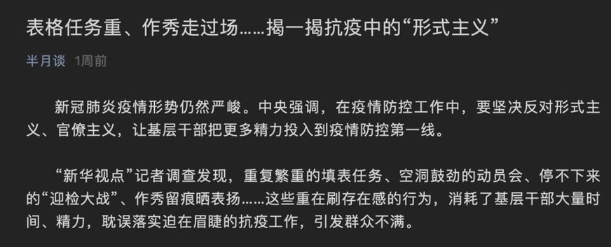 西部省份一位宣傳部門負(fù)責(zé)人告訴半月談?dòng)浾?,他們縣成立了疫情指揮部,并下設(shè)不同組,但組與組之間缺乏溝通,實(shí)際上仍然各自為政。“就拿防疫與檢測(cè)工作來講,指揮部統(tǒng)一安排后,其他部門依然安排本部門、本行業(yè)的防疫及檢測(cè)。基層人手本就不夠,各部門再各吹各的號(hào),就更亂了?!?/p>