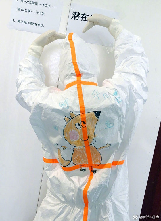 武漢兒童醫(yī)院新冠肺炎患兒隔離病房里,不少住院小朋友見(jiàn)到被防護(hù)服層層包裹的醫(yī)護(hù)人員時(shí),曾經(jīng)的第一反應(yīng)是害怕和抗拒。護(hù)士王佳想到了一個(gè)妙招:在防護(hù)服上面畫(huà)卡通畫(huà),再讓小朋友涂色。在她的帶動(dòng)下,病區(qū)里很多醫(yī)務(wù)人員都也這么做。一幅幅承載著愛(ài)心的畫(huà),沖淡了疫情給孩子們的心理壓力。(記者才揚(yáng);武漢兒童醫(yī)院供圖)