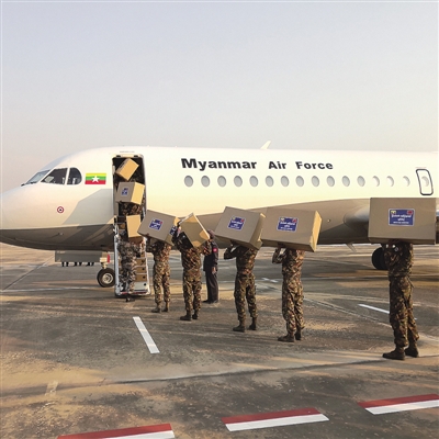 2月25日清晨迎著朝陽(yáng),緬甸國(guó)防軍使用空軍飛機(jī)運(yùn)送N95級(jí)別口罩、護(hù)目鏡、防護(hù)服等醫(yī)療捐助物資前往中國(guó),旨在幫助中國(guó)抗擊新冠肺炎疫情,緬甸國(guó)防軍總參謀長(zhǎng)妙通烏上將、駐緬甸大使陳海、使館武官熊韶?zé)樀仍趦?nèi)比都機(jī)場(chǎng)送行。光明日?qǐng)?bào)駐仰光記者鹿鋮攝/光明圖片