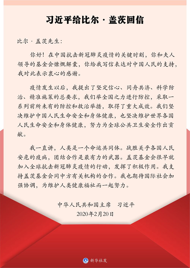 2月20日,在給美國蓋茨基金會聯(lián)席主席比爾·蓋茨的回信中,習(xí)近平主席這樣寫道。