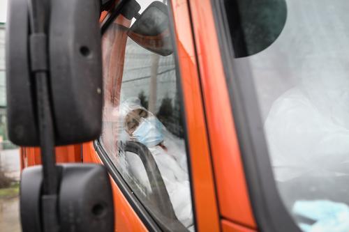 2月26日,湖北省武漢市,準(zhǔn)備進(jìn)入醫(yī)療垃圾焚燒場時,正在等待的醫(yī)療垃圾搬運(yùn)員。中青報(bào)·中青網(wǎng)記者 趙迪/攝