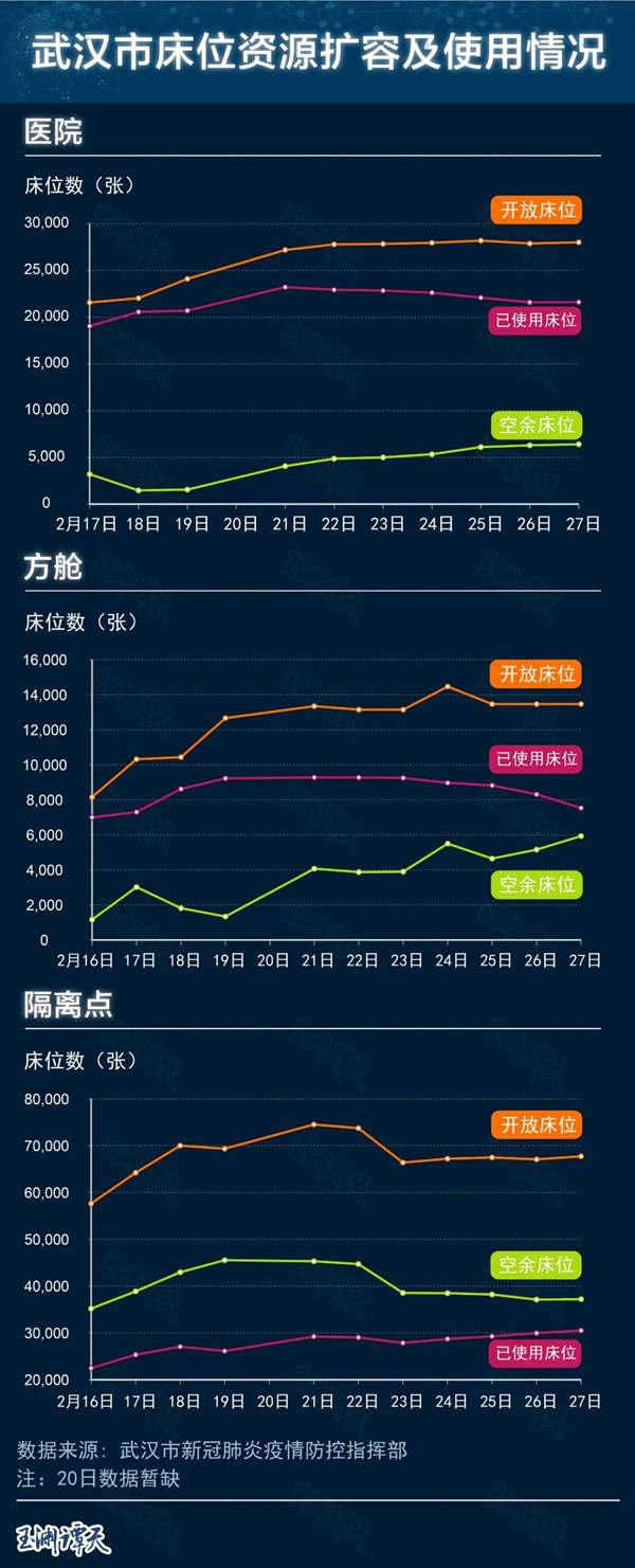譚主算了一下,從17日到27日,醫(yī)院開(kāi)放床位數(shù)的增速是29.9%,而已使用床位數(shù)的增速是13.2%。一刻不停地想辦法開(kāi)床反映了武漢疫情防控的一條主線:千方百計(jì)補(bǔ)給床位,刻不容緩?fù)炀壬?/p>