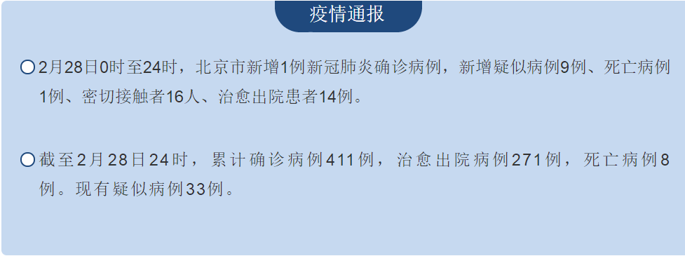 針對北京市新冠肺炎確診病例的醫(yī)療救治情況,北京市衛(wèi)生健康委新聞發(fā)言人高小俊介紹,截至2月28日24時,北京市累計報告確診病例411例,已治愈出院病例271例,治愈率65.9%;死亡病例8例,死亡率約1.9%。