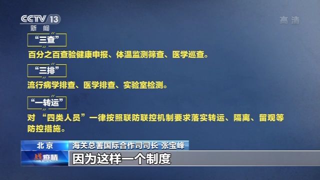 海關(guān)總署國(guó)際合作司司長(zhǎng) 張寶峰:“三查”“三排”“一轉(zhuǎn)運(yùn)”是我們海關(guān)多年來摸索探索形成的一個(gè)比較成熟的、規(guī)范的應(yīng)對(duì)重大國(guó)外疫情傳入的制度模式。運(yùn)行這個(gè)模式,主要有三個(gè)方面,第一就是海關(guān)的執(zhí)行,海關(guān)在執(zhí)行方面我們是非常有信心的。