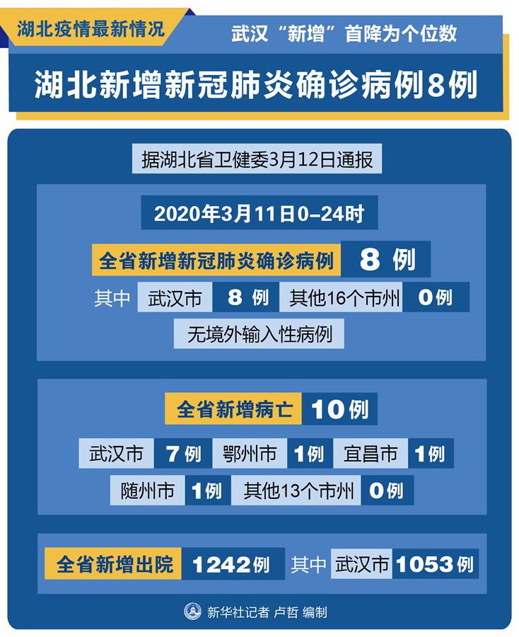 新華社武漢3月12日電(記者廖君、馮國棟)據(jù)湖北省衛(wèi)健委12日通報,2020年3月11日0—24時,全省新增新冠肺炎確診病例8例,其中:武漢市8例,其他16個市州均為0例。無境外輸入性病例。