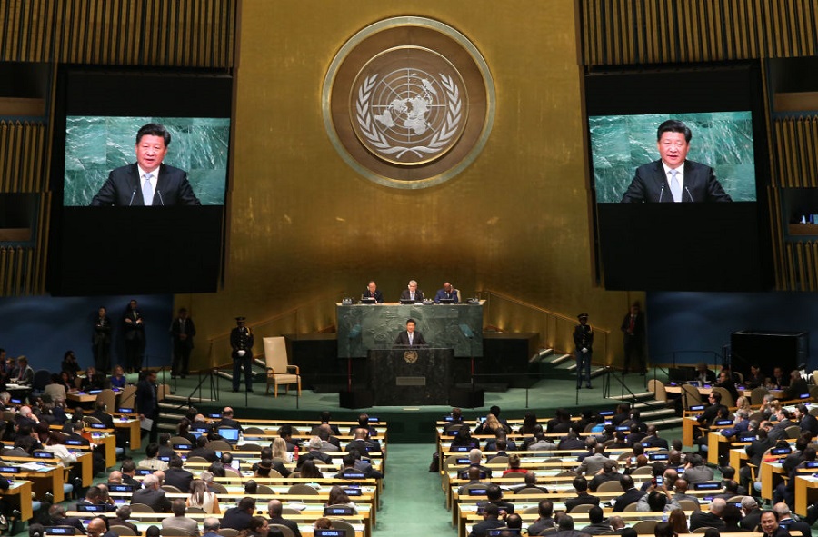 2015年9月28日,國家主席習(xí)近平在紐約聯(lián)合國總部出席第70屆聯(lián)合國大會(huì)一般性辯論并發(fā)表題為《攜手構(gòu)建合作共贏新伙伴 同心打造人類命運(yùn)共同體》的重要講話。新華社記者龐興雷攝
