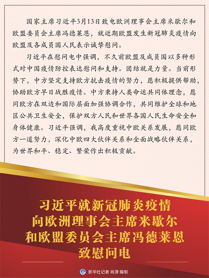 新華社北京3月14日電? 國(guó)家主席習(xí)近平3月13日致電歐洲理事會(huì)主席米歇爾和歐盟委員會(huì)主席馮德萊恩,就近期歐盟發(fā)生新冠肺炎疫情向歐盟及各成員國(guó)人民表示誠(chéng)摯慰問(wèn)。