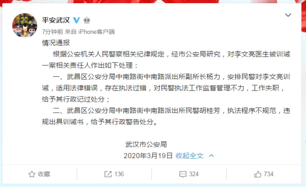 根據(jù)公安機關(guān)人民警察相關(guān)紀律規(guī)定,經(jīng)市公安局研究,對李文亮醫(yī)生被訓(xùn)誡一案相關(guān)責(zé)任人作出如下處理: