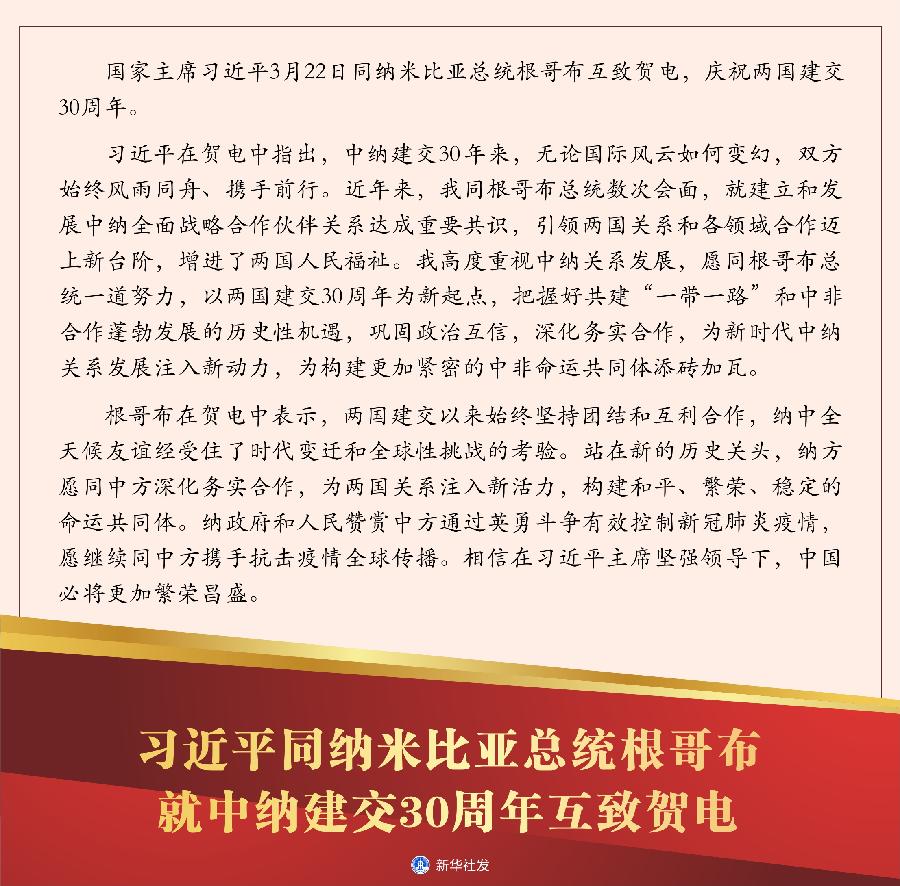 習(xí)近平在賀電中指出,中納建交30年來,無論國際風(fēng)云如何變幻,雙方始終風(fēng)雨同舟、攜手前行。近年來,我同根哥布總統(tǒng)數(shù)次會面,就建立和發(fā)展中納全面戰(zhàn)略合作伙伴關(guān)系達(dá)成重要共識,引領(lǐng)兩國關(guān)系和各領(lǐng)域合作邁上新臺階,增進(jìn)了兩國人民福祉。我高度重視中納關(guān)系發(fā)展,愿同根哥布總統(tǒng)一道努力,以兩國建交30周年為新起點(diǎn),把握好共建“一帶一路”和中非合作蓬勃發(fā)展的歷史性機(jī)遇,鞏固政治互信,深化務(wù)實(shí)合作,為新時(shí)代中納關(guān)系發(fā)展注入新動(dòng)力,為構(gòu)建更加緊密的中非命運(yùn)共同體添磚加瓦。
