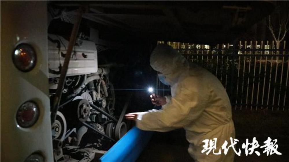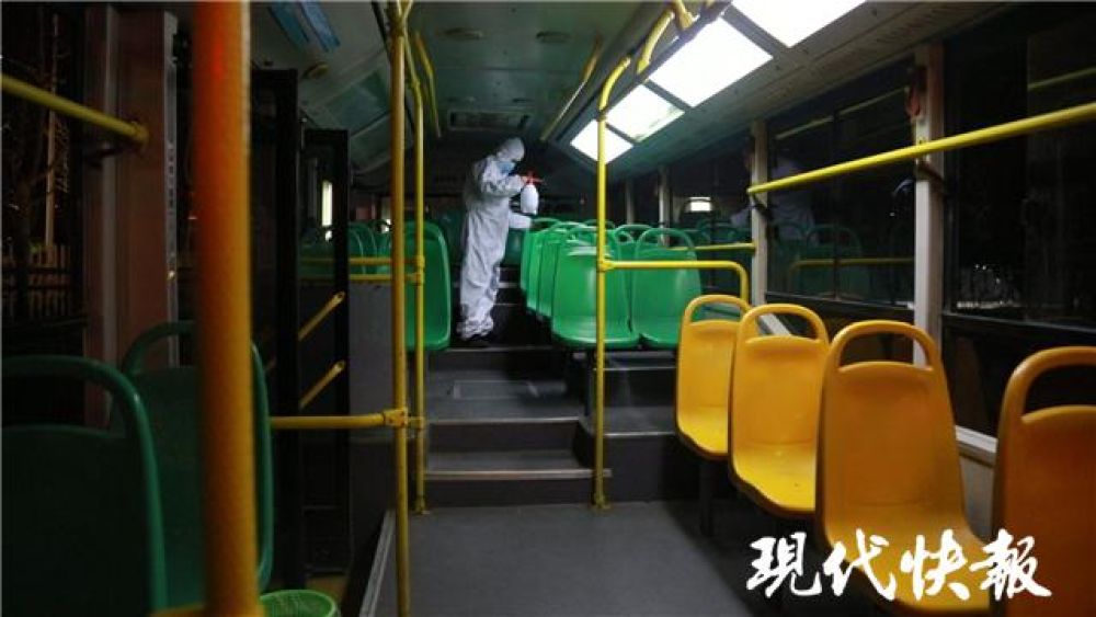 3月18日晚上8點,穿好防護服的陳強開始對405路公交車進行全方位消毒,車身、扶手、座位,任何一個角落都不放過。