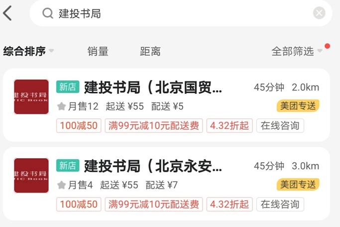 在外賣平臺(tái)上搜索可以發(fā)現(xiàn),不同書(shū)店標(biāo)注的起送價(jià)格不同,同時(shí)也會(huì)顯示店面與用戶的距離,以及需要的配送時(shí)間等信息。