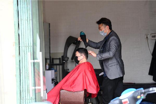 3月23日,武漢市青山區(qū)青山鎮(zhèn)街船廠社區(qū),一位居民在理發(fā)。