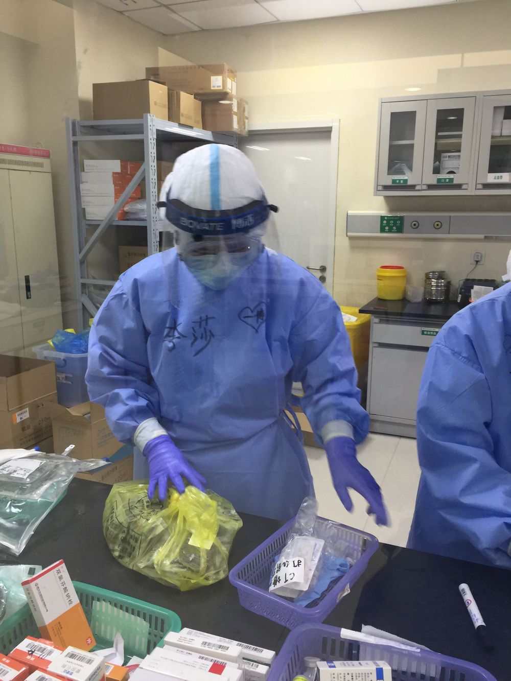我想了想,有點開玩笑地說:“家人現(xiàn)在都很平安,唯一的心愿是可以見到我最喜歡的偶像王一博?!比缓笸聜兙推鸷逭f要錄下來,并在我的防護服上寫了四個大字“一博等我”。
