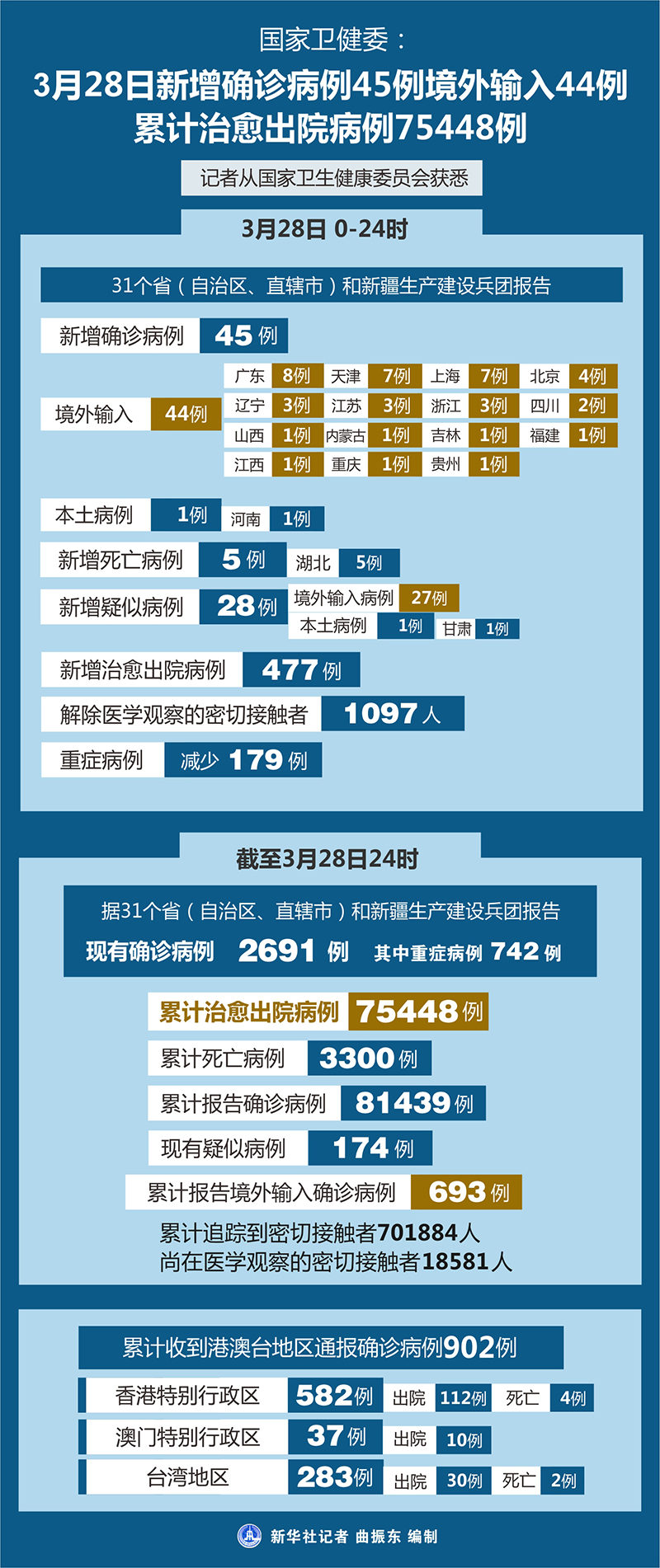 截至3月28日24時(shí),據(jù)31個(gè)?。ㄗ灾螀^(qū)、直轄市)和新疆生產(chǎn)建設(shè)兵團(tuán)報(bào)告,現(xiàn)有確診病例2691例(其中重癥病例742例),累計(jì)治愈出院病例75448例,累計(jì)死亡病例3300例,累計(jì)報(bào)告確診病例81439例,現(xiàn)有疑似病例174例。累計(jì)追蹤到密切接觸者701884人,尚在醫(yī)學(xué)觀察的密切接觸者18581人。