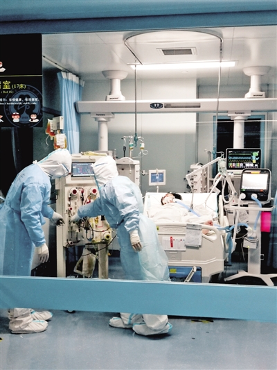 東院區(qū)重癥監(jiān)護室內,危重癥患者在接受人工肝治療。圖片由武漢大學人民醫(yī)院提供