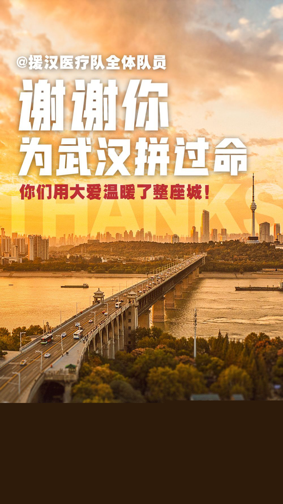 新冠肺炎疫情突如其來,武漢疫情牽動著全國人民的心,武漢成為疫情防控斗爭的重中之重和決勝之地。在以習(xí)近平同志為核心的黨中央堅強領(lǐng)導(dǎo)下,人民解放軍、全國各地鼎力相助、火線馳援。兩個多月來,你們毅然告別家人,白衣執(zhí)甲、逆行出征,日夜奮戰(zhàn)在看不見硝煙的戰(zhàn)場上,同時間賽跑、與病魔較量,涌現(xiàn)出一大批可歌可泣的先進典型和感人事跡,為打贏武漢保衛(wèi)戰(zhàn)發(fā)揮了中堅力量的作用,展現(xiàn)了醫(yī)者仁心的崇高精神,展現(xiàn)了新時代醫(yī)務(wù)工作者的良好形象,感動了武漢,感動了中國,感動了世界!在此,中共武漢市委、武漢市人民政府和一千多萬武漢市民,向你們致以最崇高的敬意和最誠摯的感謝!