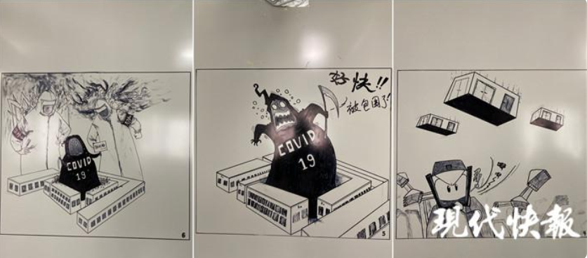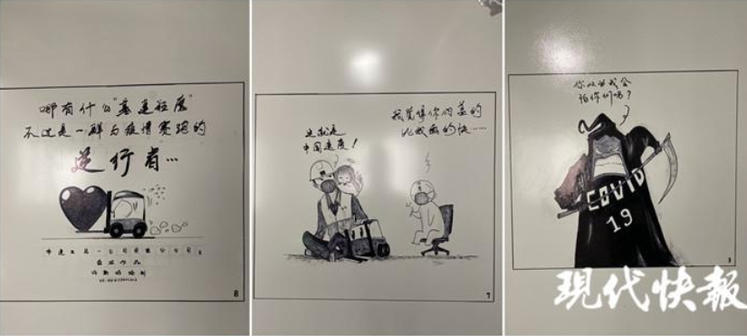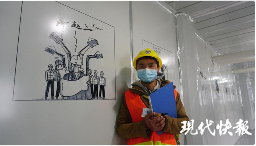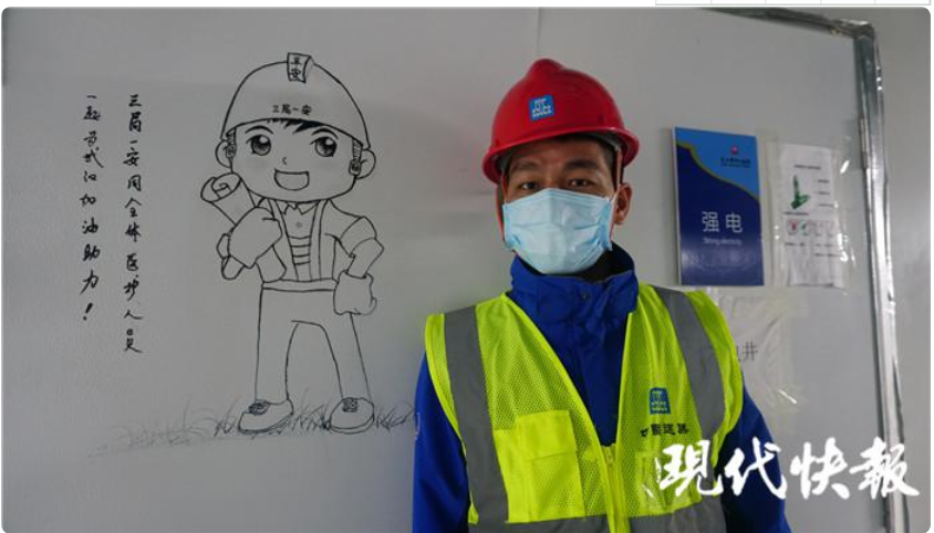 許新焰看到醫(yī)護(hù)人員通道的一面墻空著,就用一組漫畫,把中建三局建設(shè)醫(yī)院對抗 " 疫魔 " 的過程,用9幅漫畫體現(xiàn)出來。" 就是想給醫(yī)護(hù)人員、志愿者和我們這些維保隊(duì)員力量,我們用幾天時(shí)間就把醫(yī)院建起來了,這樣的速度,不怕疫魔。" 他說,每幅漫畫大約需要耗費(fèi)一兩個(gè)小時(shí),有時(shí)畫著畫著就要出工,前前后后花了七八天的時(shí)間,才把整組漫畫全部畫完。