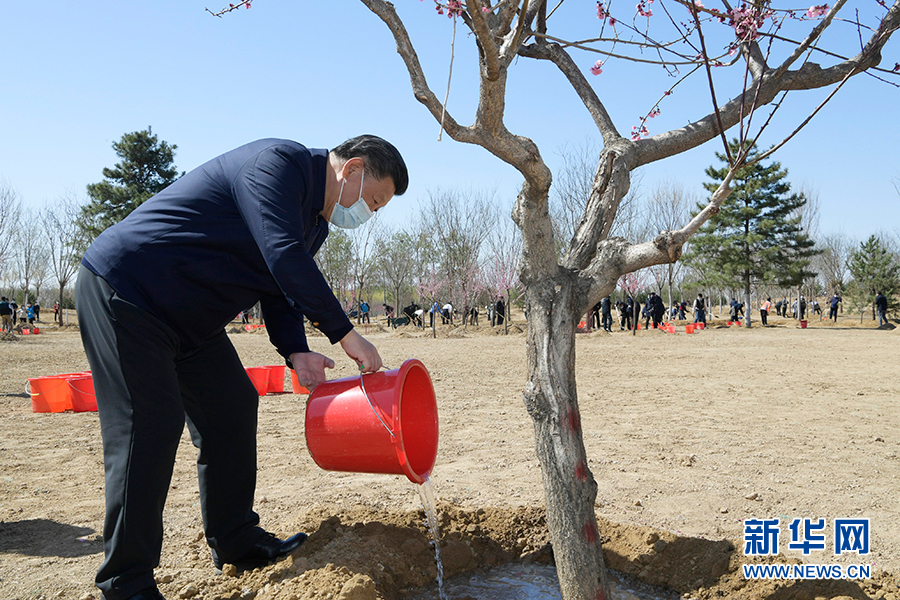 揮鍬鏟土、培土圍堰、提水澆灌……習近平接連種下油松、國槐、杏梅、元寶楓、西府海棠、金銀木、紅瑞木。在和煦的春風中,挺拔的樹苗錯落有致,鮮艷的花朵迎風招展,初綻的枝葉格外清新。植樹現(xiàn)場一片繁忙景象。參加勞動的領導同志同大家一起培土澆水,氣氛熱烈。