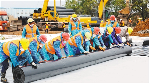 中建三局火神山醫(yī)院建設(shè)者在施工現(xiàn)場鋪設(shè)“兩布一膜”防護(hù)層。 (資料照片)