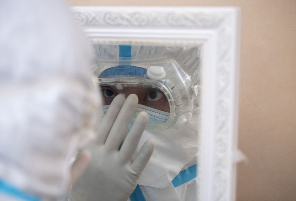 ↑3月13日晚,“擺渡人”小分隊(duì)隊(duì)員楊暉檢查護(hù)目鏡的佩戴情況。隊(duì)員的防護(hù)措施同重癥病房的醫(yī)生一樣,完成所有防護(hù)措施要經(jīng)過12個(gè)步驟。在華中科技大學(xué)同濟(jì)醫(yī)學(xué)院附屬同濟(jì)醫(yī)院光谷院區(qū),有很多生命“擺渡人”?!皵[渡人”日夜在醫(yī)院與醫(yī)院之間,留觀點(diǎn)與醫(yī)院之間穿梭不停,轉(zhuǎn)運(yùn)新冠肺炎患者。