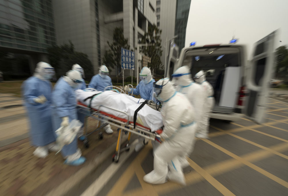 ↑3月6日,在華中科技大學(xué)附屬同濟(jì)醫(yī)院中法新城院區(qū),醫(yī)護(hù)人員護(hù)送一名新冠肺炎患者去做CT檢查。