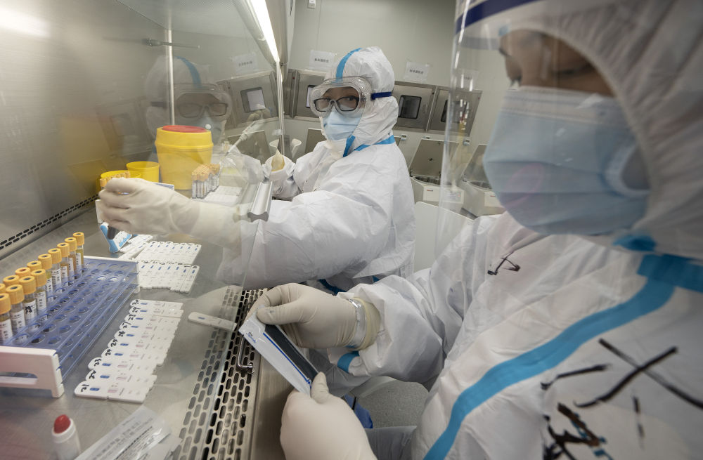 ↑3月4日,在武漢雷神山醫(yī)院醫(yī)學(xué)檢驗(yàn)科,工作人員在對患者的血液樣本進(jìn)行檢測。