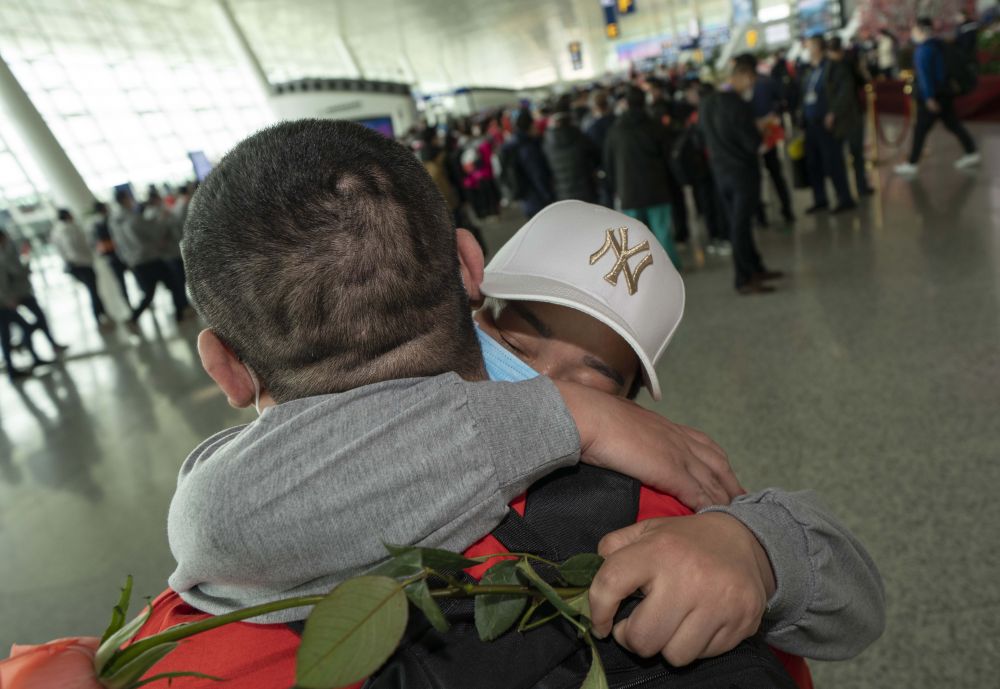 ↑3月19日,在武漢天河機(jī)場,河南醫(yī)療隊(duì)隊(duì)員郭燕姿緊緊抱住丈夫王國曉。 夫妻二人都來自河南新鄉(xiāng),王國曉是醫(yī)生,郭燕姿是護(hù)士長。2月9日,夫妻倆馳援武漢,隨后,郭燕姿被分配到青山方艙醫(yī)院工作,而王國曉則被分配到了另外一個(gè)區(qū)。從那以后,夫妻倆已有一個(gè)多月沒有見面。3月19日當(dāng)天,夫妻倆在機(jī)場重逢。