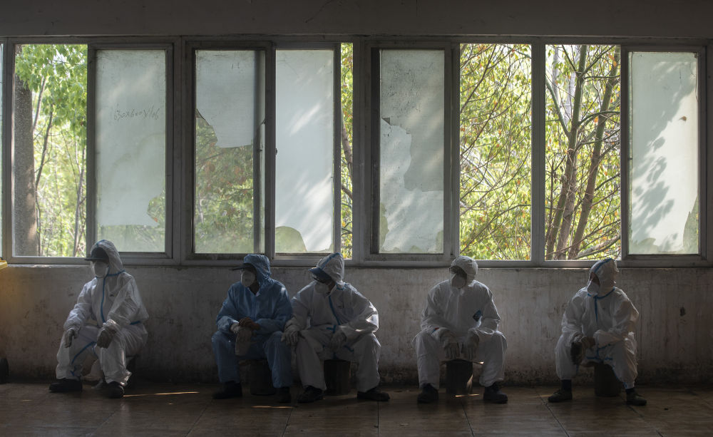 ↑3月26日清晨,在等待運(yùn)送醫(yī)療廢物抵達(dá)的時(shí)候,王鵬(右二)和同事一起聊天。這是12個(gè)小時(shí)的工作時(shí)間里,最清閑的十幾分鐘,因?yàn)檫\(yùn)送醫(yī)療廢物的卡車還在從醫(yī)院到這里的路上。