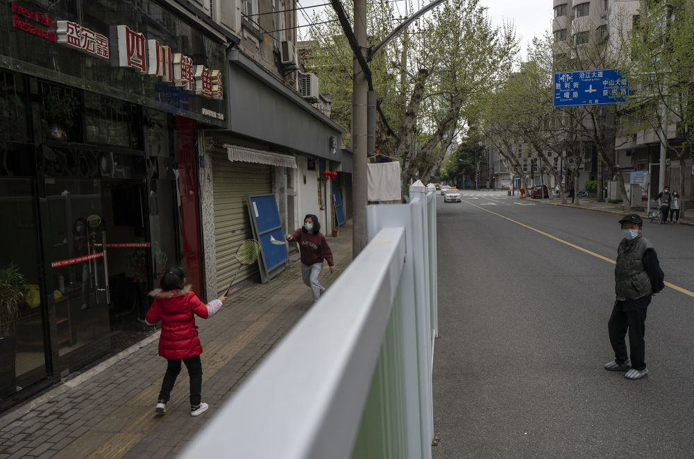 ↑4月1日,在武漢的一個(gè)社區(qū)里,人們在隔離墻內(nèi)打打羽毛球。