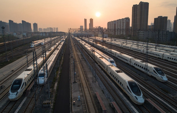 在武漢動車段,列車4月8日停靠在存車線上準(zhǔn)備投入運(yùn)行(無人機(jī)照片)。新華社記者肖藝九攝