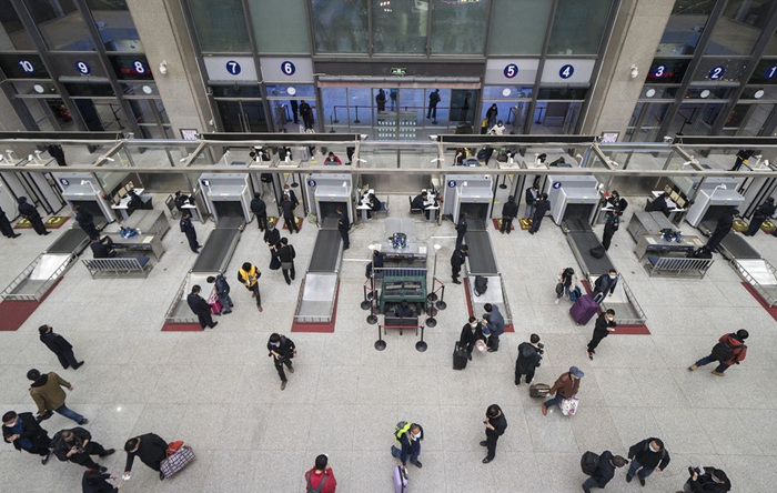 4月7日晚,旅客接受安檢后進(jìn)入武昌火車站。新華社記者 費(fèi)茂華 攝