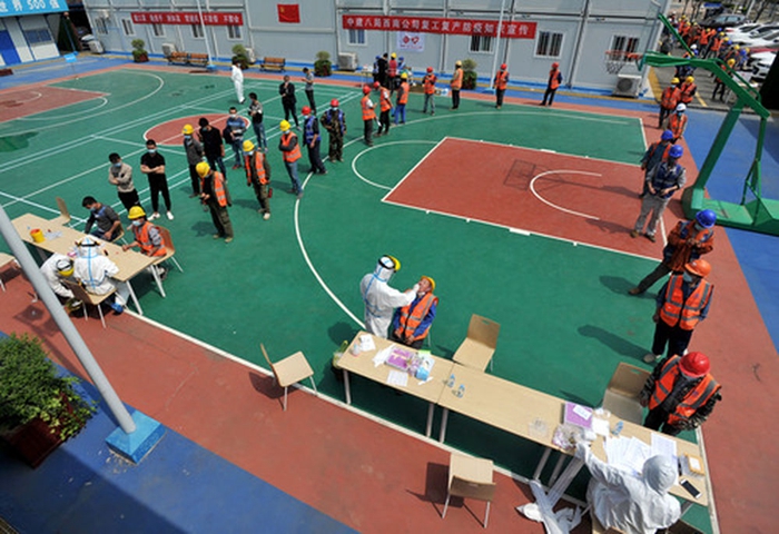 在中建八局武漢中央文化區(qū)萬達(dá)項目部,返崗員工4月7日在接受核酸和抗體指標(biāo)檢測。 新華社發(fā)(史偉 攝)
